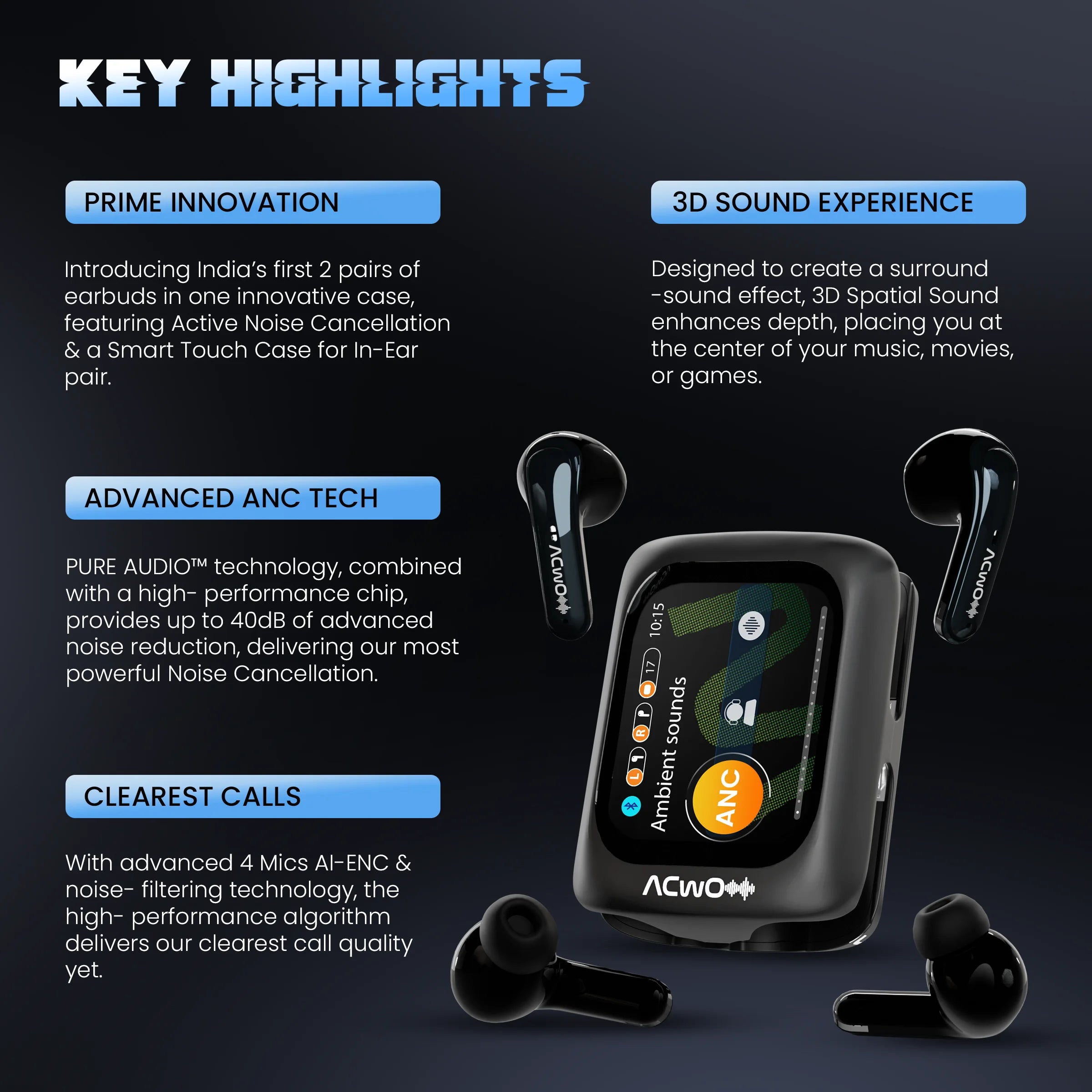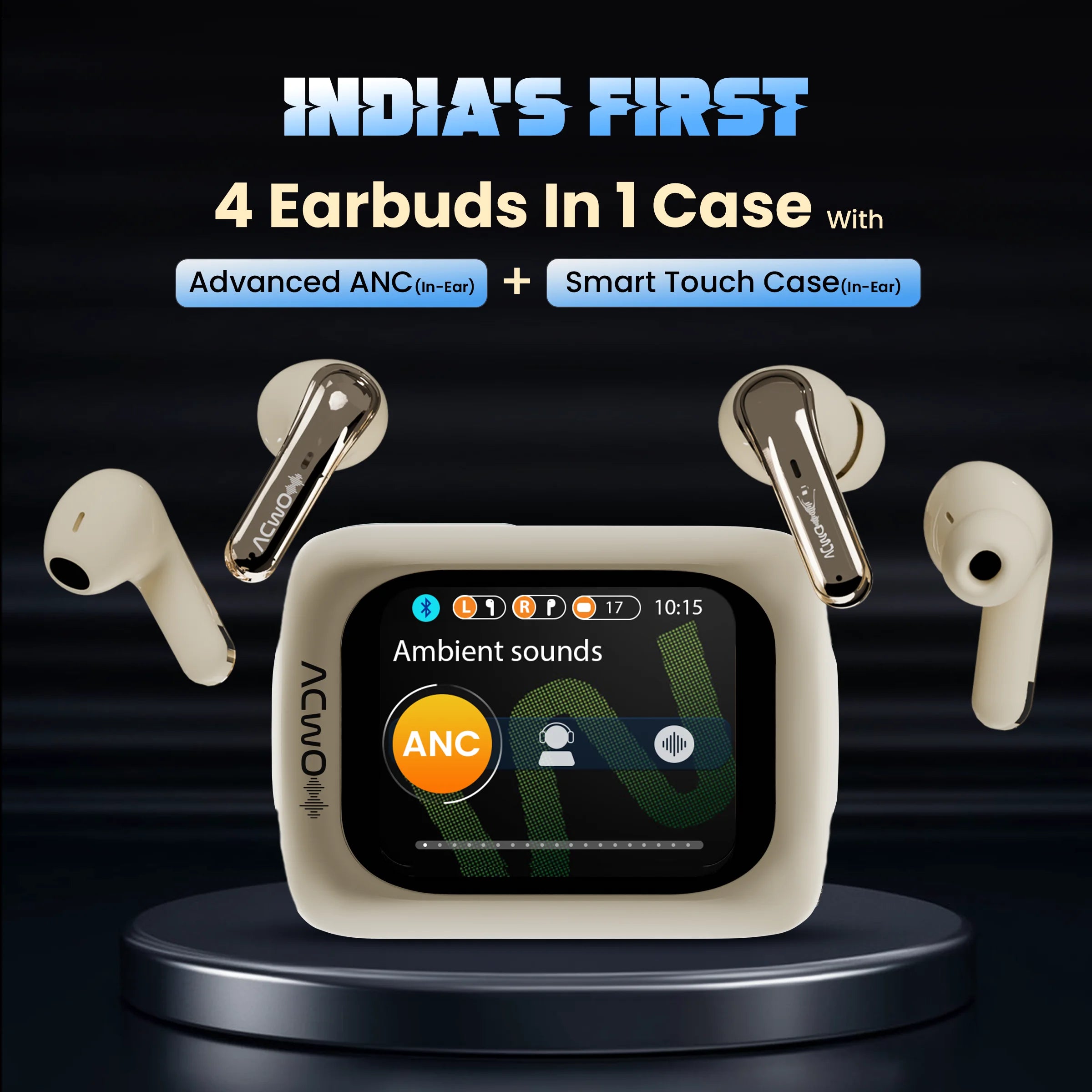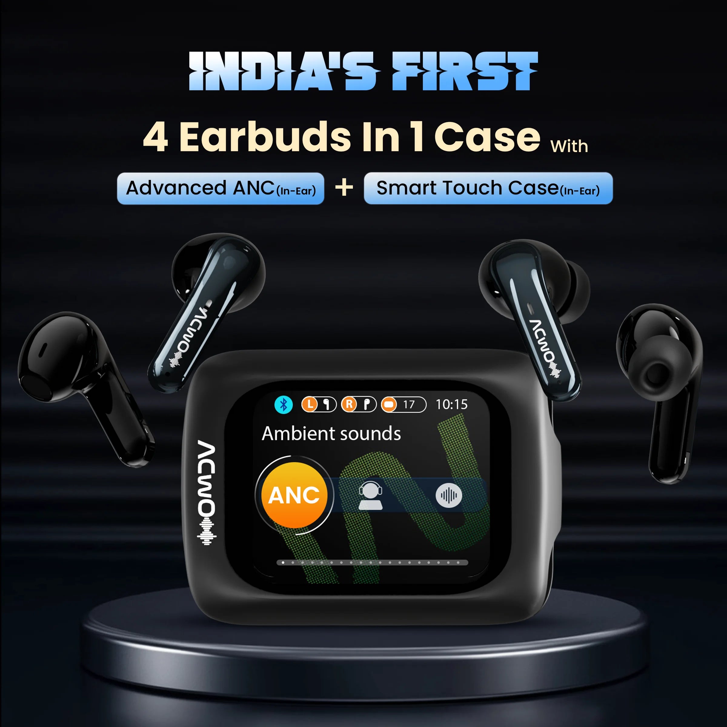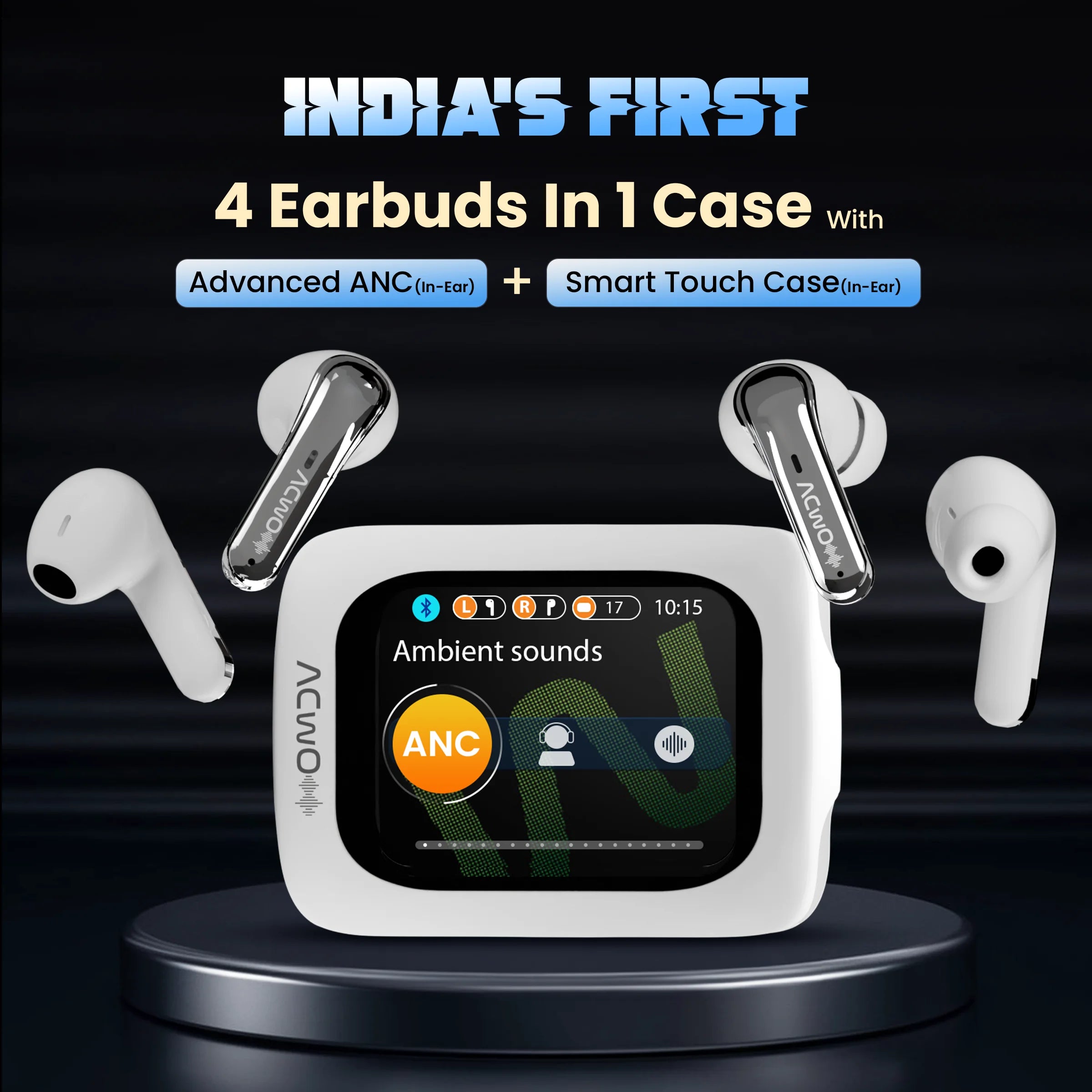 4 in 1 Earbuds | Smart Touch Display | ANC upto 40dB (In-Ear) | 80Hrs Playback Time | Quad Mic with AI-ENC